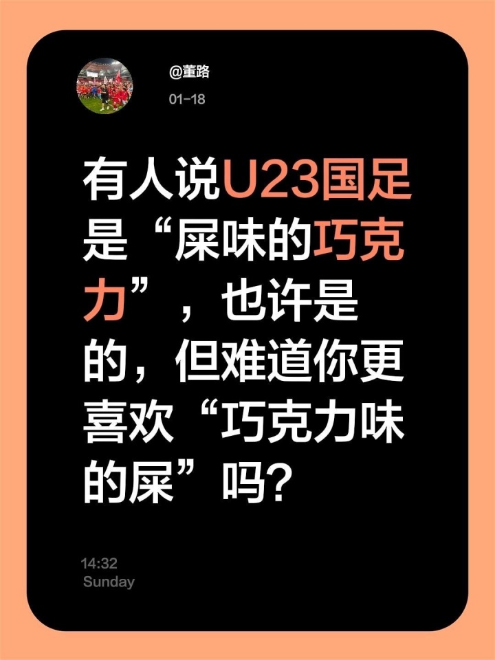 不管怎么样,来到这个舞台就是“赚到了”。希望小伙子们能够继续向前,希望王钰栋能够实现进球突破,希望李昊能够继续超神,也希望五星红旗能够第一次在决赛的舞台上升起。